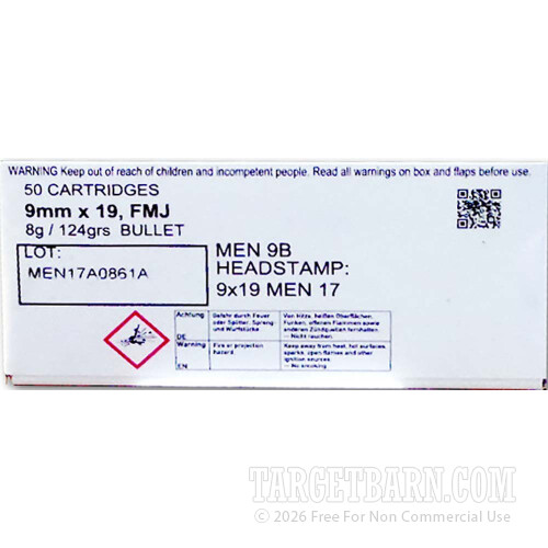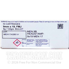 MEN 9mm Luger Ammunition - 50 Rounds of 124 Grain FMJ