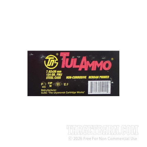 Tula 7.62x39 Ammunition - 100 Rounds of 124 Grain FMJ